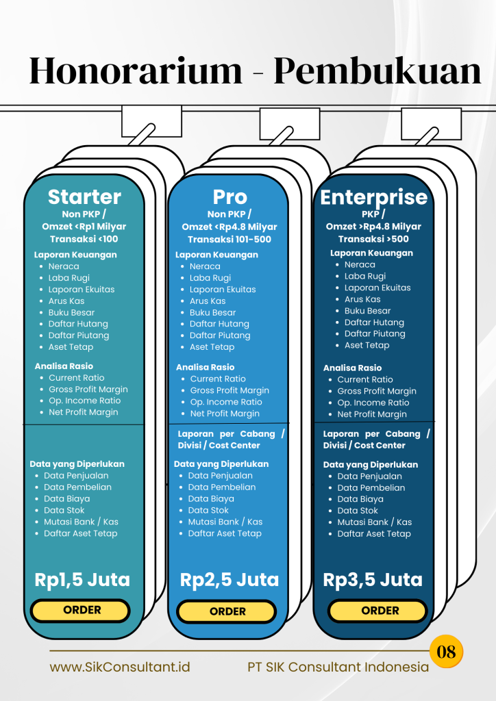 Laporan keuangan sangat penting dan bagian yang sangat diperlukan dalam bisnis. Kami menawarkan solusi pembukuan dengan biaya terjangkau tanpa harus mempekerjakan staf akuntansi. Kami mengerjakan pembukuan sampai menghasilkan laporan keuangan setiap bulan sesuai dengan Standar Akuntansi Keuangan yang berlaku di Indonesia.